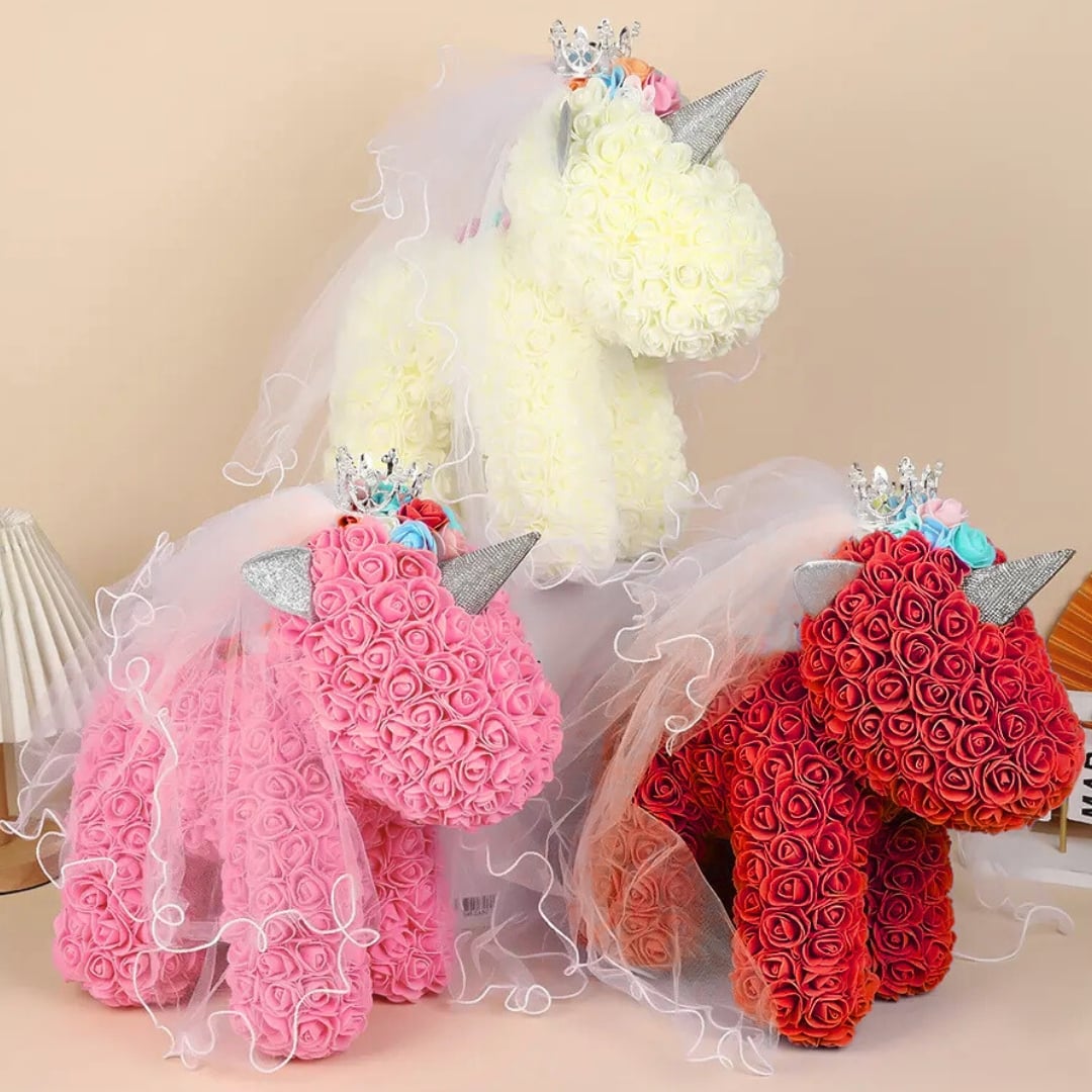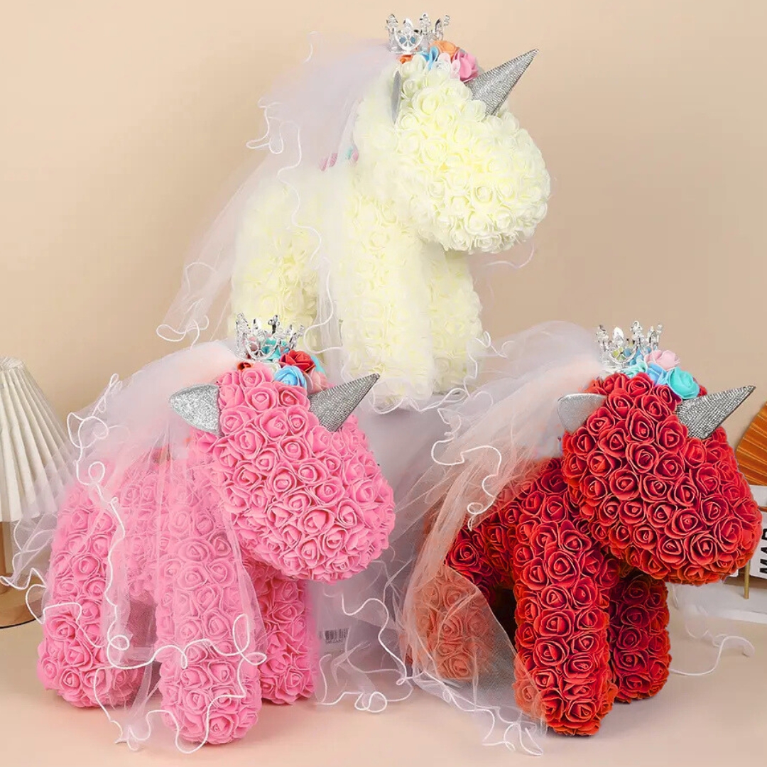 Ονειρεμένο, ρομαντικό και γεμάτο γοητεία, αυτός ο μονόκερος από τεχνητά τριαντάφυλλα είναι ένα δώρο που μαγνητίζει τα βλέμματα.