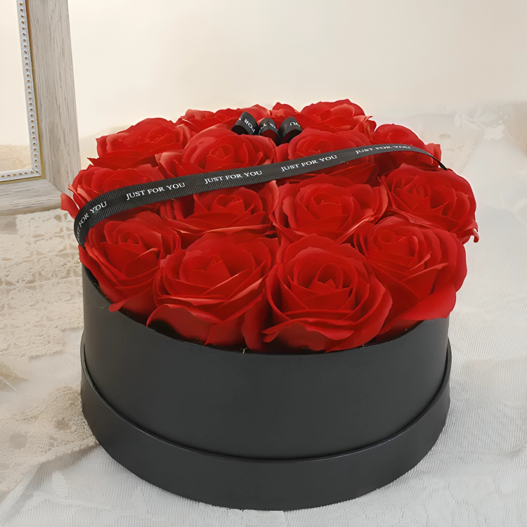 Μπουκέτο με Τεχνητά Κόκκινα Τριαντάφυλλα σε Στρογγυλό Κουτί - 22cm