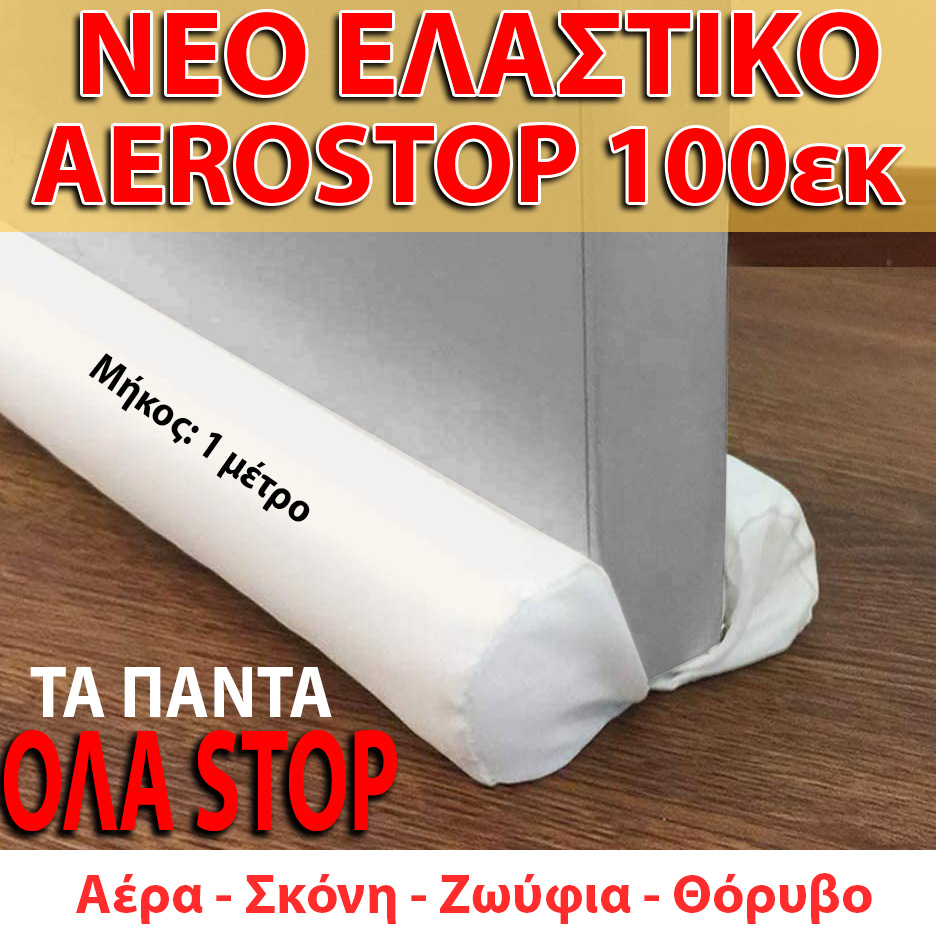 Πείτε "ΣΤΟΠ" στο κρύο τον χειμώνα και τη ζέστη το καλοκαίρι με το ΝΕΟ έξυπνο "AEROSTOP 100"! Είναι το μοναδικό στην Ελλάδα που προσαρμόζει σε θωρακισμένη πόρτα πάχους έως 8 εκ. Με ελαστικότητα που εφαρμόζει τέλεια σε όλες τις πόρτες. Προστατεύει το χώρο σας από τον αέρα, τη σκόνη, τα ζωύφια και τον ενοχλητικό θόρυβο!
