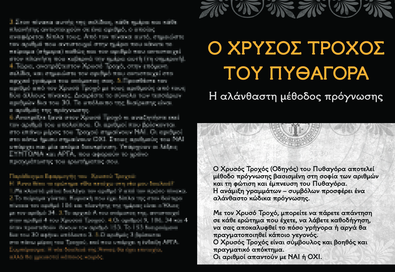 Ο Χρυσός Τροχός (Οδηγός) του Πυθαγόρα αποτελεί μέθοδο πρόγνωσης βασισμένη στη σοφία των αριθμών και τη φώτιση και έμπνευση του Πυθαγόρα. Η ανάμιξη γραμμάτων – συμβόλων προσφέρει ένα αλάνθαστο κώδικα πρόγνωσης.