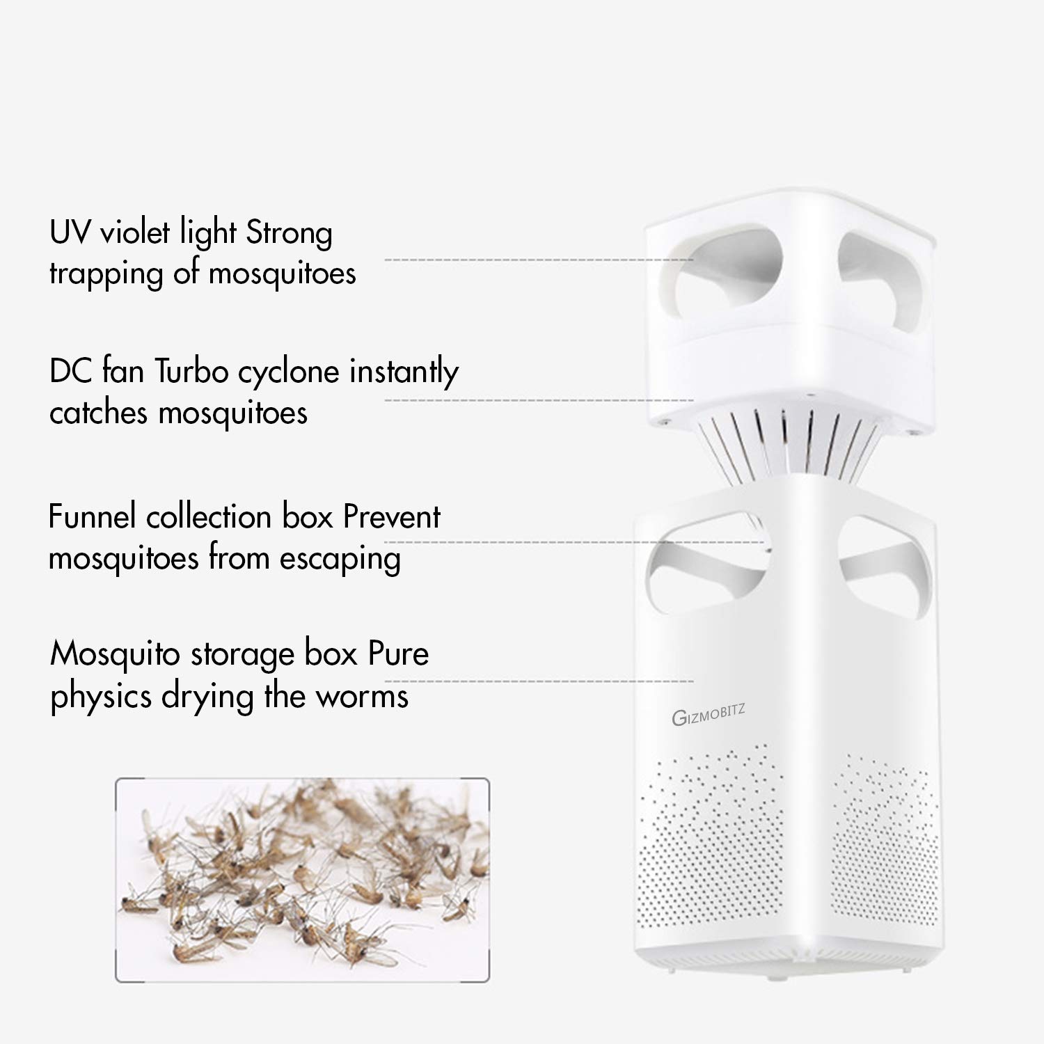 Ο Εξολοθρευτής Κουνουπιών & Εντόμων με Αναρρόφηση και Φωτοκατάλυση διαθέτει ισχυρά UV LED το φως των οποίων προσελκύει όλα τα έντομα και η έξυπνη δίνη (ρουφήχτρα) που δημιουργείτε από τον ανεμιστήρα - τα ρουφάει! Ο πιο σίγουρος, ασφαλής και υγιεινός τρόπος για να απαλλαγείτε από κουνούπια, σκνίπες, μύγες, σφίγγες και άλλα ενοχλητικά έντομα.