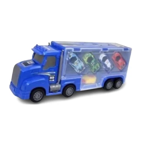 Η μεγάλη μπλε νταλίκα διαθέτει διάφανη καρότσα για αποθήκευση και μεταφορά, ενώ τα αυτοκινητάκια είναι εξοπλισμένα με μηχανισμό pull-back, για να τρέχουν μόνα τους με μία απλή ανάσυρση.