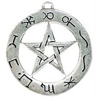 Οι επτά πλανήτες του αρχαίου κόσμου από τη μία πλευρά και από την άλλη απόκρυφα σύμβολα από το γιαταγάνι του Μείζονος Κλειδιού του Σολομώντα, ενισχύουν τις μαγικές δυνάμεις της πεντάλφας.