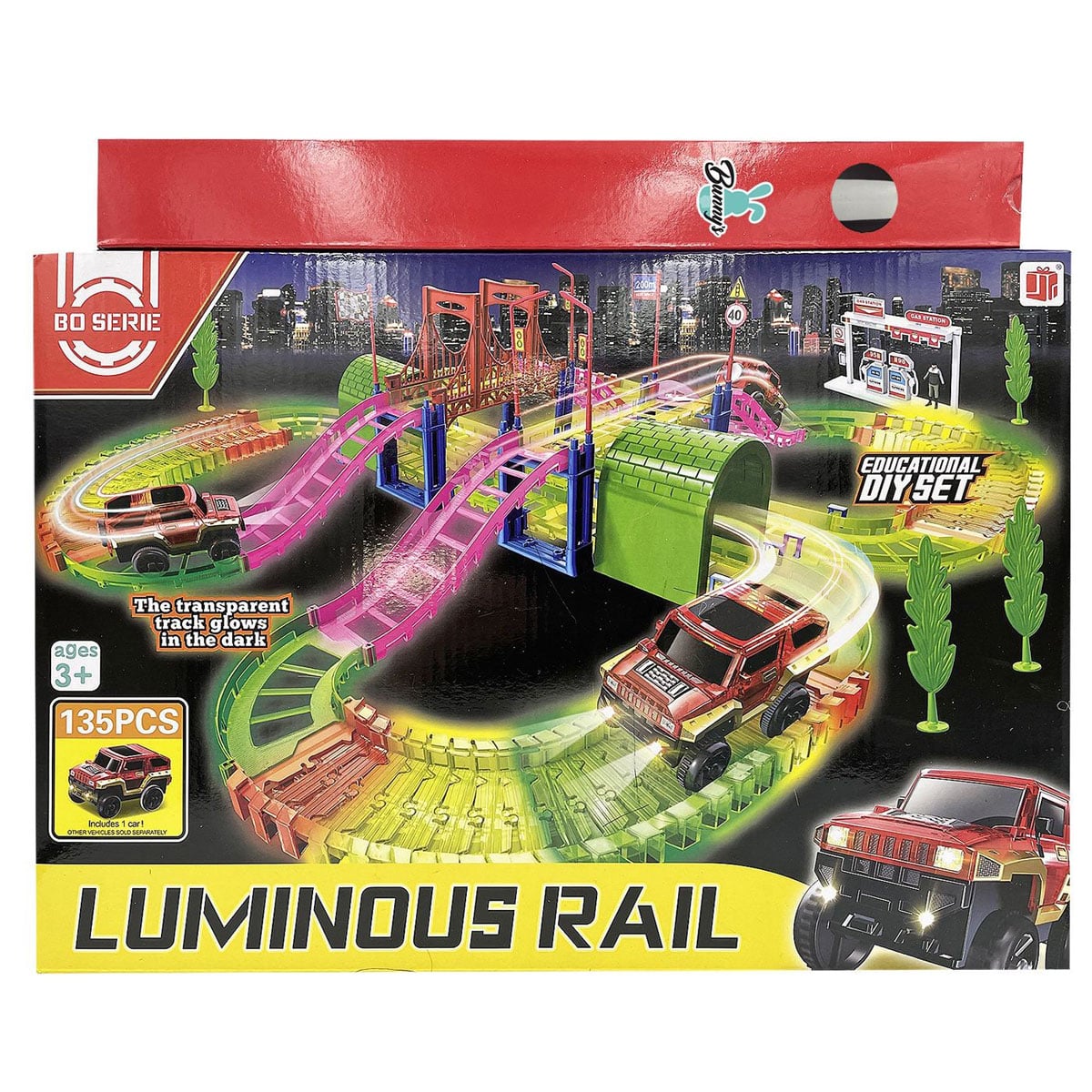 Το παιχνίδι συνεχίζεται ακόμη και όταν σβήσουν τα φώτα. Τα φωσφορίζοντα κομμάτια δημιουργούν μοναδικό εφέ στο σκοτάδι, ενισχύοντας τη φαντασία και τον ενθουσιασμό. Το παιδί στήνει τη δική του πίστα, πειραματίζεται με τις διαδρομές και ζει την εμπειρία ενός πραγματικού αγώνα.