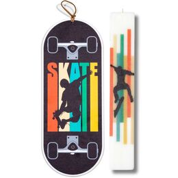 Η λευκή πλακέ λαμπάδα διακοσμείται με πολύχρωμα γραμμικά στοιχεία σε αποχρώσεις πορτοκαλί, πράσινου και κίτρινου, ενώ η μαύρη φιγούρα skateboard προσθέτει βάθος και ένταση στο σύνολο.