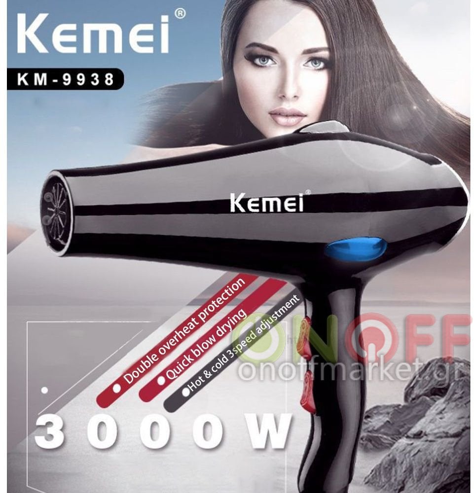 Πιστολάκι - Σεσουάρ Μαλλιών 3000W με Επιλογή Ταχύτητας και Επιλογή Κρύου-Ζεστού Αέρα KEMEI KM-9938