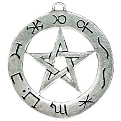 Οι επτά πλανήτες του αρχαίου κόσμου από τη μία πλευρά και από την άλλη απόκρυφα σύμβολα από το γιαταγάνι του Μείζονος Κλειδιού του Σολομώντα, ενισχύουν τις μαγικές δυνάμεις της πεντάλφας.Μέγεθος: 38 x 26mm
