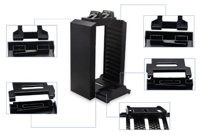 Αυτή η βάση αποθήκευσης αποτελείται από πέντε μεγάλα κομμάτια πλαστικού με διαφορετικά σχήματα. Στη βάση αποθήκευσης μπορούν να τοποθετηθούν 12 παιχνίδια και να στερεώσετε την κονσόλα PS4 στην δεξιά πλευρά.