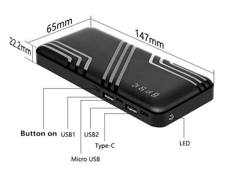 Διαθέτει 4 LED ενδείξεις φόρτισης (25%, 50%, 75% και 100%), 2 θύρες USB για να φορτίζετε όχι μόνο μία, αλλά δυο συσκευές ταυτόχρονα, θύρα microUSB και type-c για να επαναφορτίζεται και φακό για να βλέπετε στο σκοτάδι!