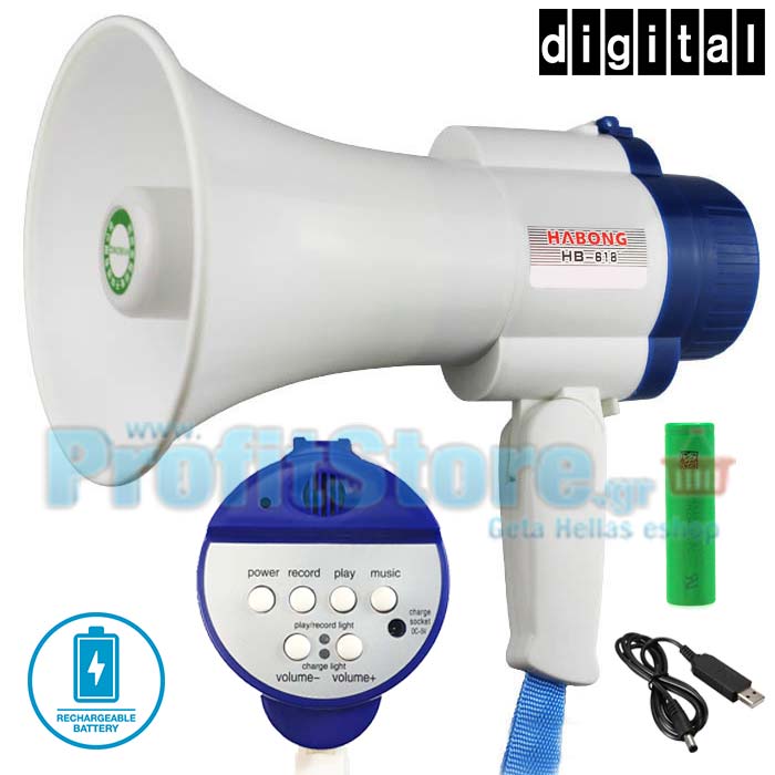 Ψηφιακός Επαναφορτιζόμενος Ισχυρός Τηλεβόας με δυνατότητα καταγραφής μηνύματος έως 100 δευτερόλεπτα και αυτόματη επανάληψη μηνύματος.