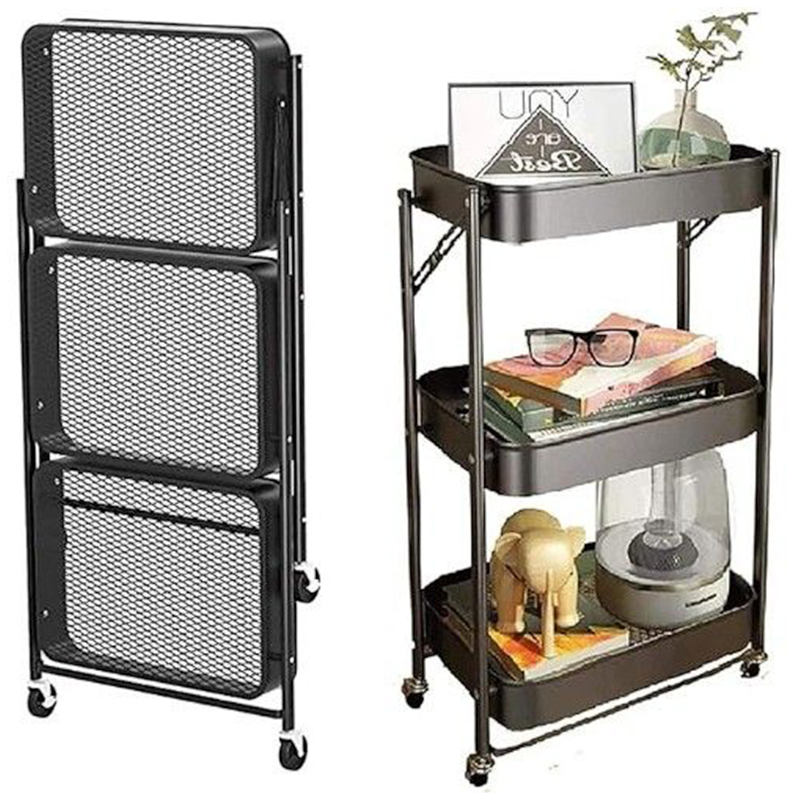 - 1 x Πτυσσόμενη Τροχήλατη Ραφιέρα - Καρότσι Τριών Επιπέδων με 3 Ράφια & Ροδάκια - Τρόλεϊ Οργάνωσης, Διακόσμησης 45x30x77cm - Μαύρο