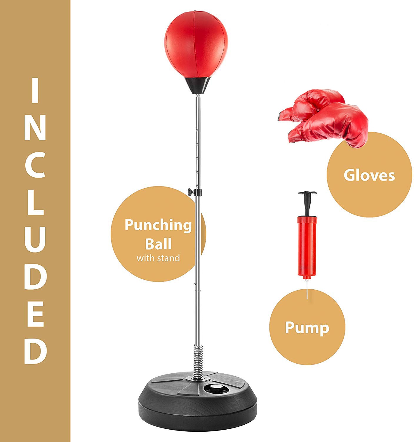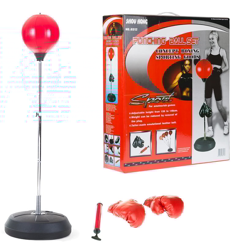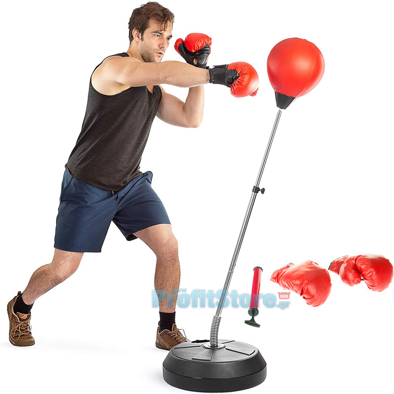 Ένα εξαιρετικό σετ πυγμαχίας αυξομειούμενου ύψους, με μπάλα μποξ, βάση δαπέδου και γάντια.