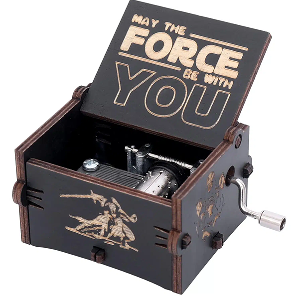 Ξύλινο μουσικό κουτί με ρετρό εμφάνιση και χαραγμένες λεπτομέρειες από το star wars με το γνωστό "may the force be with you" που είπε ο Jedi Master.