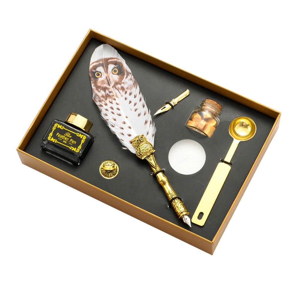 Ρετρό Σετ Πένα Καλλιγραφίας με Φτερό Κουκουβάγιας & Σφραγίδα Διπλής Χρήσης με Κερί - Vintage Dipping Feather Pen