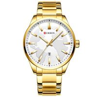 Ανδρικό αδιάβροχο ρολόι Curren με χρυσό μπρασελέ από ανοξείδωτο ατσάλι, μεταλλική χρυσή κάσα και λευκό καντράν διακοσμημένο με ανάγλυφο σχέδιο, χρυσές λεπτομέρειες και ένδειξη ημερομηνίας.