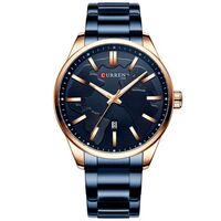 Ανδρικό αδιάβροχο ρολόι Curren με μπλε μπρασελέ από ανοξείδωτο ατσάλι, μεταλλική ροζ-χρυσή κάσα και μπλε καντράν διακοσμημένο με ανάγλυφο σχέδιο, ροζ-χρυσές λεπτομέρειες και ένδειξη ημερομηνίας.