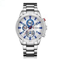 Ανδρικό αδιάβροχο ρολόι Curren με ασημί μπρασελέ από ανοξείδωτο ατσάλι, μεταλλική ασημί κάσα και λευκό καντράν διακοσμημένο με ανάγλυφο σχέδιο, ασημί λεπτομέρειες και ένδειξη ημερομηνίας.