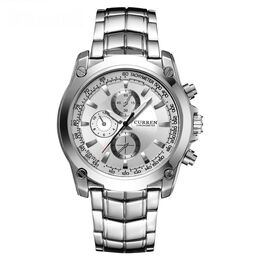 Ανδρικό αδιάβροχο ρολόι Curren με ασημί μπρασελέ από ανοξείδωτο ατσάλι, μεταλλική ασημί κάσα και λευκό καντράν διακοσμημένο με ανάγλυφο σχέδιο, ασημί λεπτομέρειες και ένδειξη ημερομηνίας.
