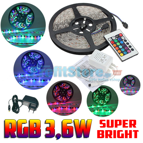 Σετ Αδιάβροχη Ταινία LED 5 μέτρων RGB SMD 3,6W SuperBright 12V με τηλεχειριστήριο