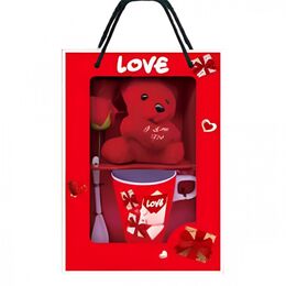 Το σετ δώρου Love συνδυάζει μια κόκκινη κούπα με σχέδια καρδιών, ένα μαλακό αρκουδάκι και ένα τεχνητό κόκκινο τριαντάφυλλο, δημιουργώντας μια ολοκληρωμένη και τρυφερή πρόταση δώρου.
