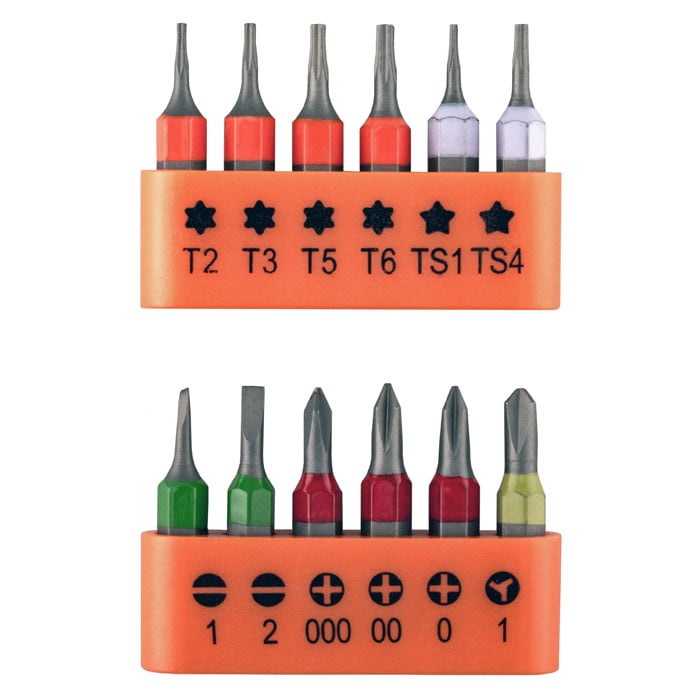 1x βεντούζα, 2x μοχλοί, 1x τριγωνικός μοχλός, 1x τσιμπίδα, 3x σταυροί (PH000-00-0), 2x ίσια (1.0,2.0 mm), 4x αστεράκια εξάγωνα (T2,T3,T5,T6), 2x αστεράκια πεντάγωνα(TS1,TS4), 1x tri-wing (Y1)