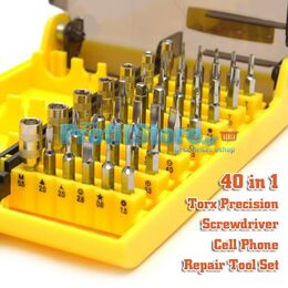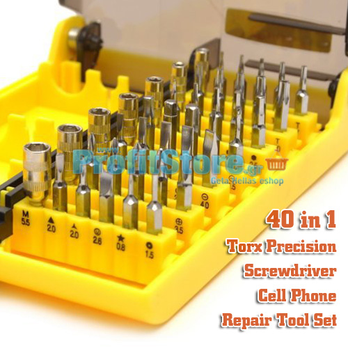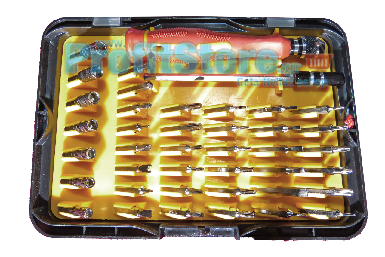 Σετ εργαλείων με 39 διαφορετικές κεφαλές που καλύπτουν το μεγαλύτερο μέρος των βιδών που χρησιμοποιούνται σε συσκευές κινητών τηλεφώνων αλλά και σε διάφορες άλλες ηλεκτρονικές μικροσυσκευές όπως PC, Laptops, Video, Playstation, PDA κλπ.