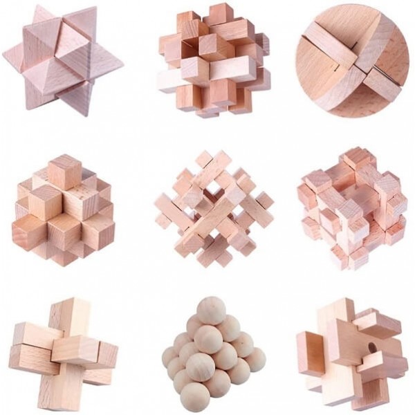- Η συσκευασία περιλαμβάνει 9 ξύλινα παζλ και έντυπο με τη λύση των γρίφων.