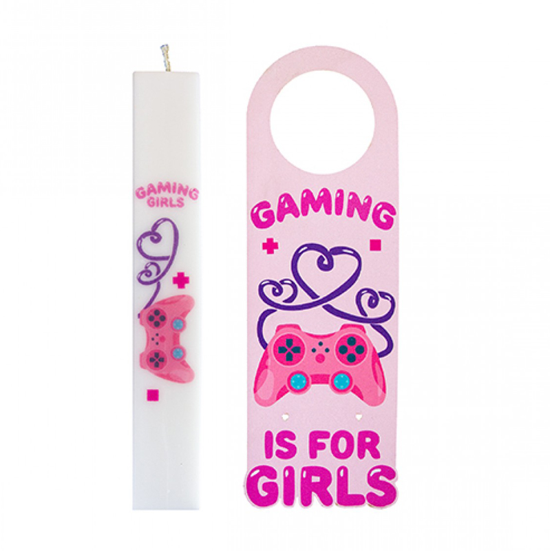 Σετ Παιδική Λαμπάδα με Εκτύπωση Gaming Girl σε Κερί Πλακέ 4,5x29,5cm & Αναμνηστικό Ξύλινο Καδράκι 11x32cm