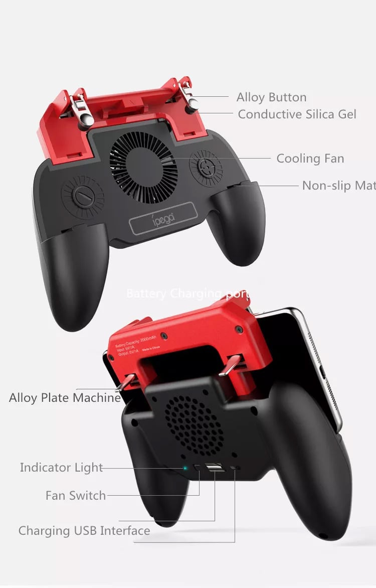 Για όλους εσάς τους fun παιχνιδιών shooting και όχι μόνο, που σας αρέσει να παίζεται παιχνίδια στα smartphones σας, τώρα σας παρουσιάζουμε αυτό το controller Gamepad το οποίο ενσωματώνει μπαταρία 2000mAh powerbank και ανεμιστήρα ψύξης. Ιδανικό για να παίζετε shooting games όπως Pubg & Fortnite που απαιτούν πολλούς χειρισμούς ταυτόχρονα!