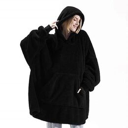 SoftHug Φλις Κουβέρτα με Μανίκια, Κουκούλα & Ζεστό Γουνάκι - Oversized Φούτερ για το σπίτι Μαύρη
