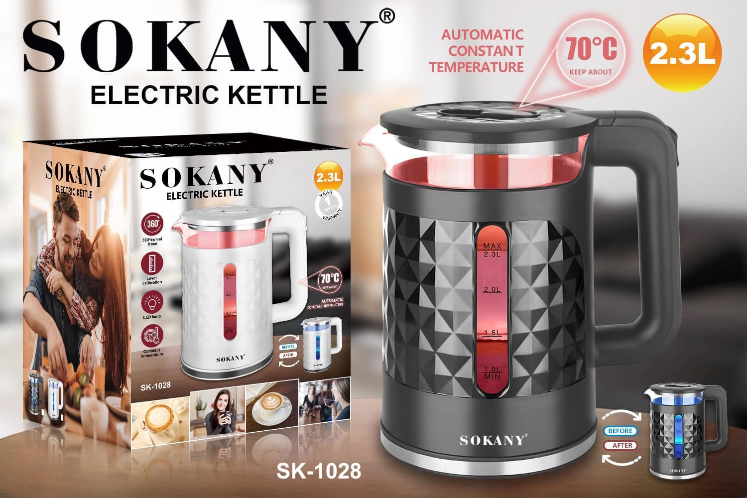 Ο βραστήρας της εταιρείας Sokany, διαθέτει ισχύ 2000 Watt και χωρητικότητα 2.3 λίτρα. Μπορεί να σας προσφέρει έως και 11 φλιτζάνια ζεστού νερού.