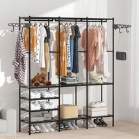 Τροχήλατη διπλή μεταλλική κρεμάστρα δαπέδου με 5 ράφια για ολοκληρωμένη οργάνωση ρούχων, παπουτσιών και αξεσουάρ. Στιβαρή κατασκευή, πλαϊνές κρεμάστρες και ροδάκια για εύκολη μετακίνηση. Ιδανική για σπίτι ή επαγγελματικό χώρο.