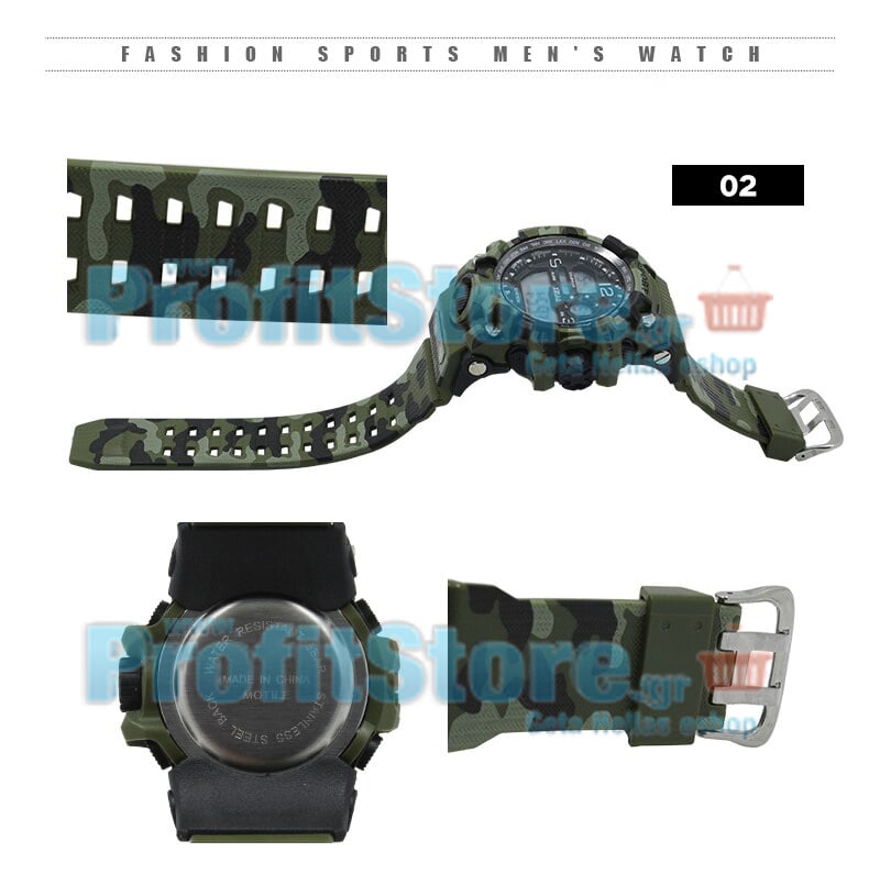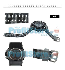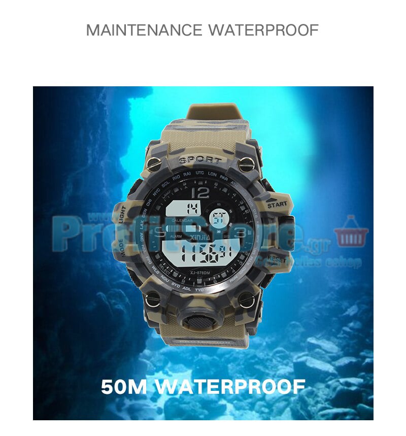 Εντυπωσιακός ψηφιακός χρονογράφος της Xinjiai. Σπορ, αδιάβροχος, σε 3 όμορφα camouflage χρώματα για κάθε γούστο. Φωτιζόμενος με ένδειξη ώρας, χρονόμετρο, 50m αδιάβροχο (5 ATM) και φυσικά με πλήρες αυτόματο ημερολόγιο, ένδειξη ημέρας, ημερομηνίας και ξυπνητήρι.