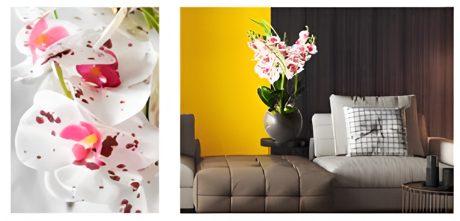 Τα ρεαλιστικά άνθη σε ροζ και λευκούς τόνους, σε συνδυασμό με τα πράσινα φύλλα, δημιουργούν μια ισορροπημένη και κομψή εικόνα που ταιριάζει εύκολα σε κάθε χώρο.