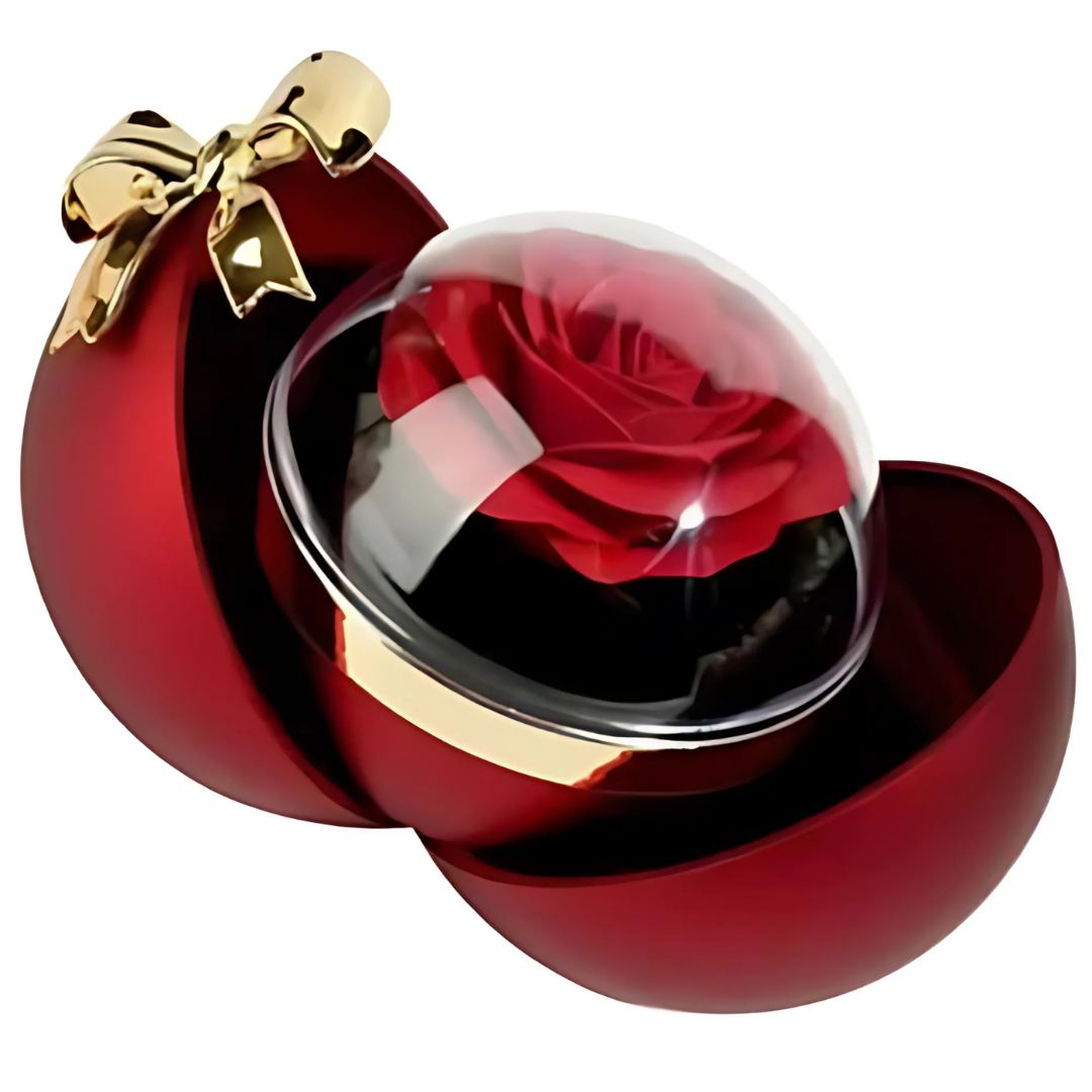 Το εσωτερικό αποκαλύπτει ένα τεχνητό τριαντάφυλλο εξαιρετικής ποιότητας, προστατευμένο μέσα σε διαφανή θόλο που ενισχύει την τρισδιάστατη αίσθηση και την αίσθηση “μουσειακού” εκθέματος.