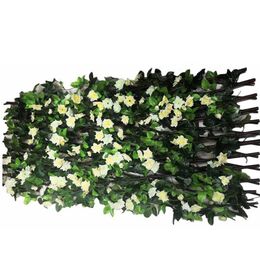 Πτυσσόμενος Τεχνητός Φράχτης με Συνθετική Φυλλωσιά Κισσό & Λευκά Άνθη σε Ξύλινη Βέργα 120x110cm