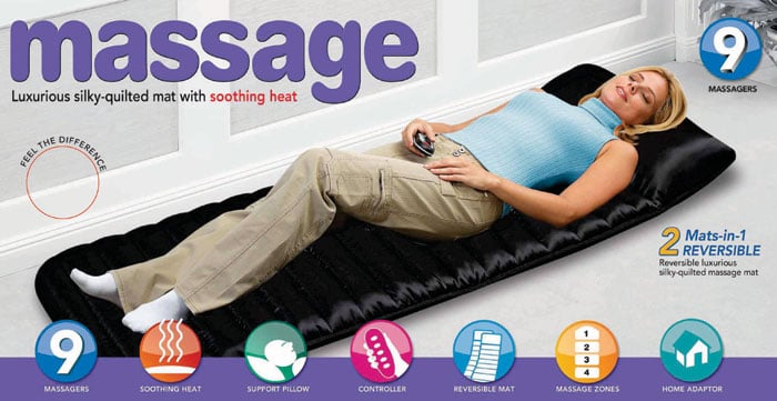 - Ένα θερμαινόμενο στρώμα μασάζ με 9 σημεία δόνησης μασάζ Mat με καταπραϋντική θερμότητα, εργονομικό σχεδιασμό και λειτουργία θέρμανσης που βοηθάει στην ανακούφιση από την ένταση, τους πόνους και τη δυσκαμψία του αυχένα και της πλάτης!