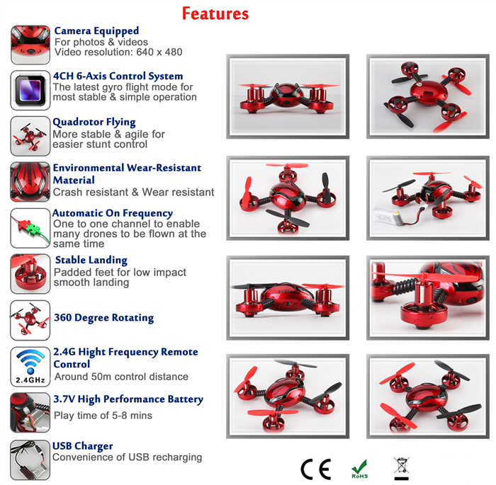 Διαθέτει εγκατεστημένη μικρο κάμερα 0,3mp ( 640x480p ) και αποθηκεύει βίντεο και φωτογραφίες σε κάρτα microSD ( περιλαμβάνεται κάρτα 2Gb ) ενώ η λειτουργία της κάμερας ελέγχεται πλήρως από το τηλεχειριστήριο.