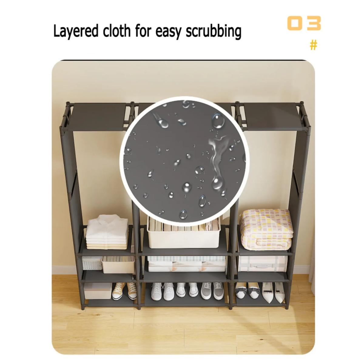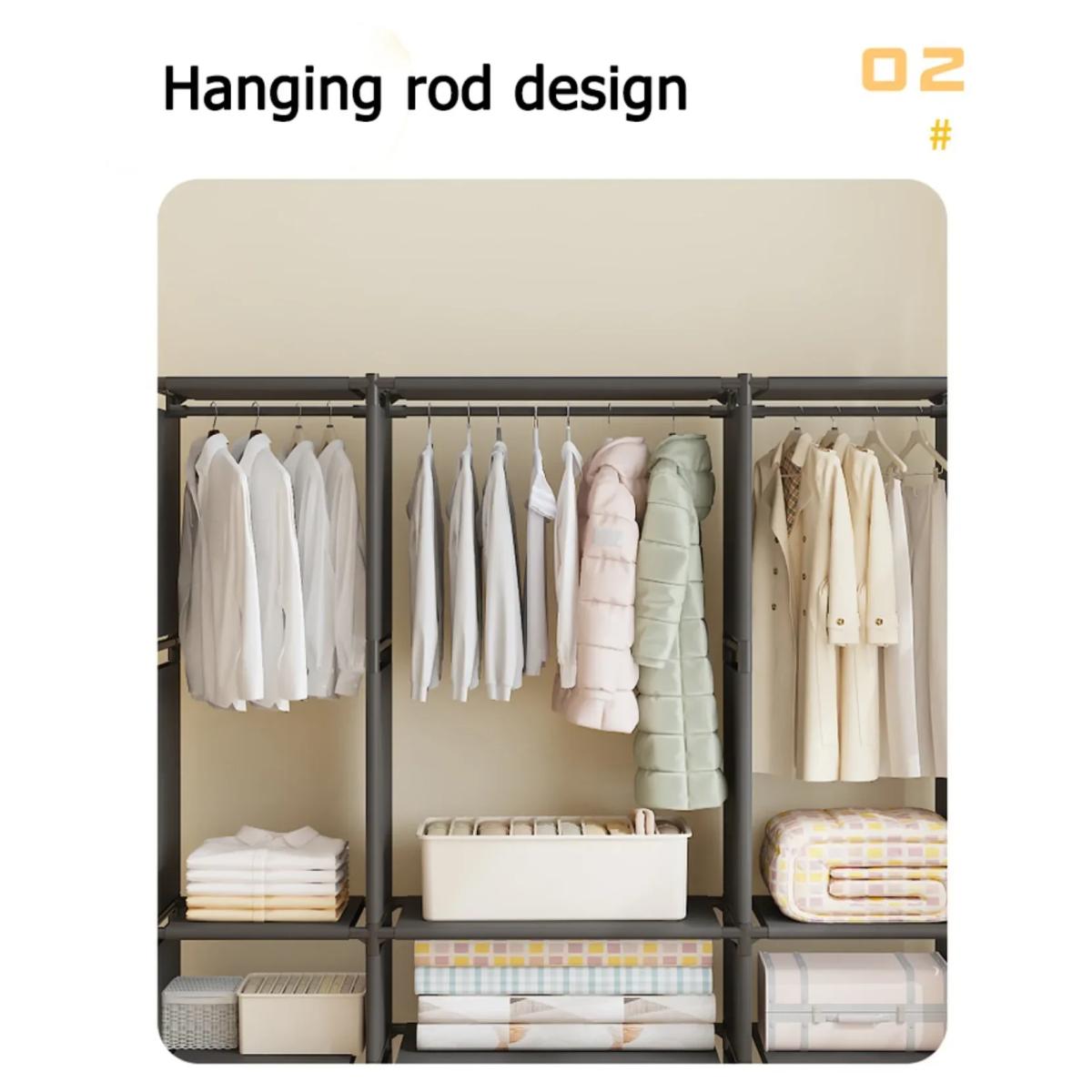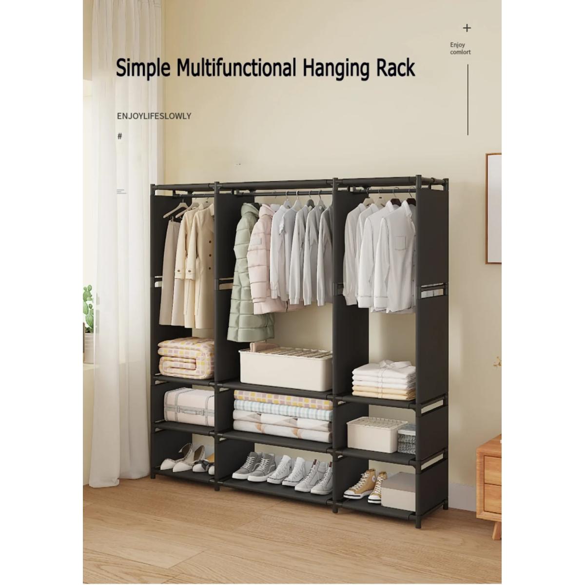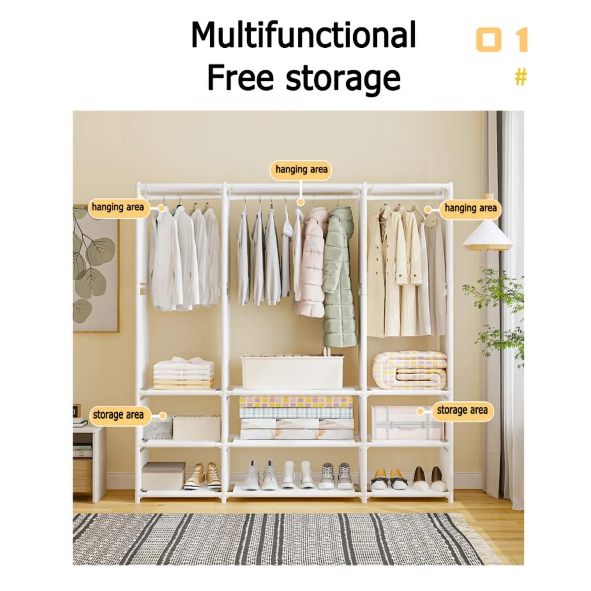 Διαθέτει πολλαπλές ράβδους ανάρτησης για να κρεμάτε ρούχα, μπουφάν και φορέματα, καθώς και πλήθος ραφιών για παπούτσια, κουτιά και αξεσουάρ. Η εύκολη συναρμολόγηση σας επιτρέπει να τη στήσετε γρήγορα χωρίς εξειδικευμένα εργαλεία, ενώ το ξεχωριστό φινίρισμα της ταιριάζει αρμονικά σε κάθε διακόσμηση.