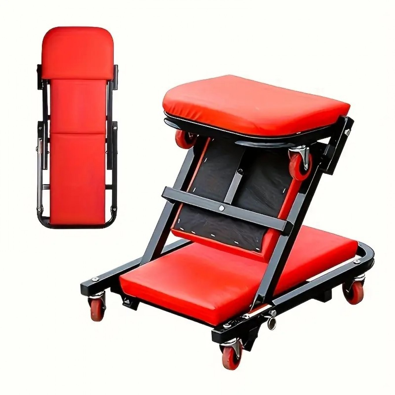 Τροχήλατο Αναδιπλούμενο Σκαμπό - Ξαπλώστρα Εργασίας 2 σε 1 με Ροδάκια 360° Κόκκινο