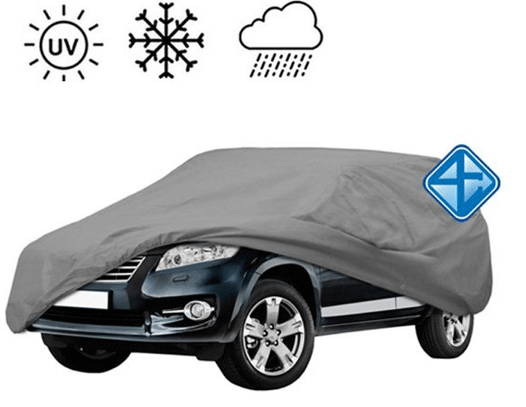 Η επιφάνεια της κουκούλας είναι αδιάβροχη και ανθεκτική στην UV ακτινοβολία, μειώνοντας τη φθορά στο χρώμα και τα πλαστικά μέρη του οχήματος, ενώ το διαπνέον υλικό βοηθά στη σωστή κυκλοφορία του αέρα.