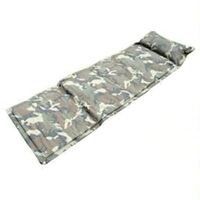 Φουσκωτό αδιάβροχο στρώμα με μαξιλάρι και μπλε σχέδιο για κάμπινγκ και υπαίθριες δραστηριότητες.