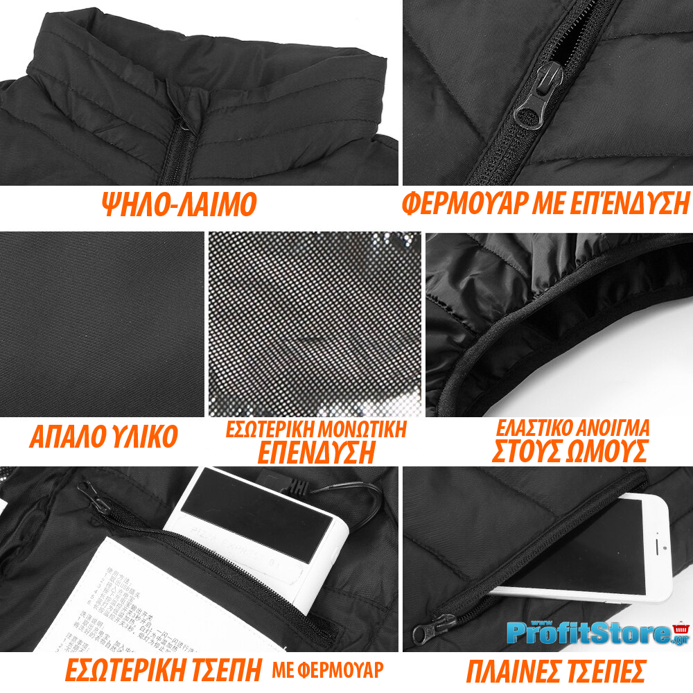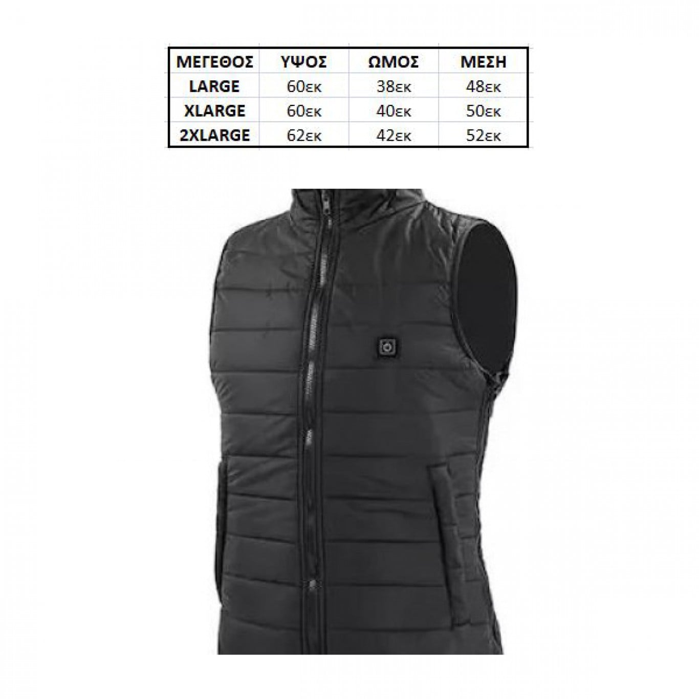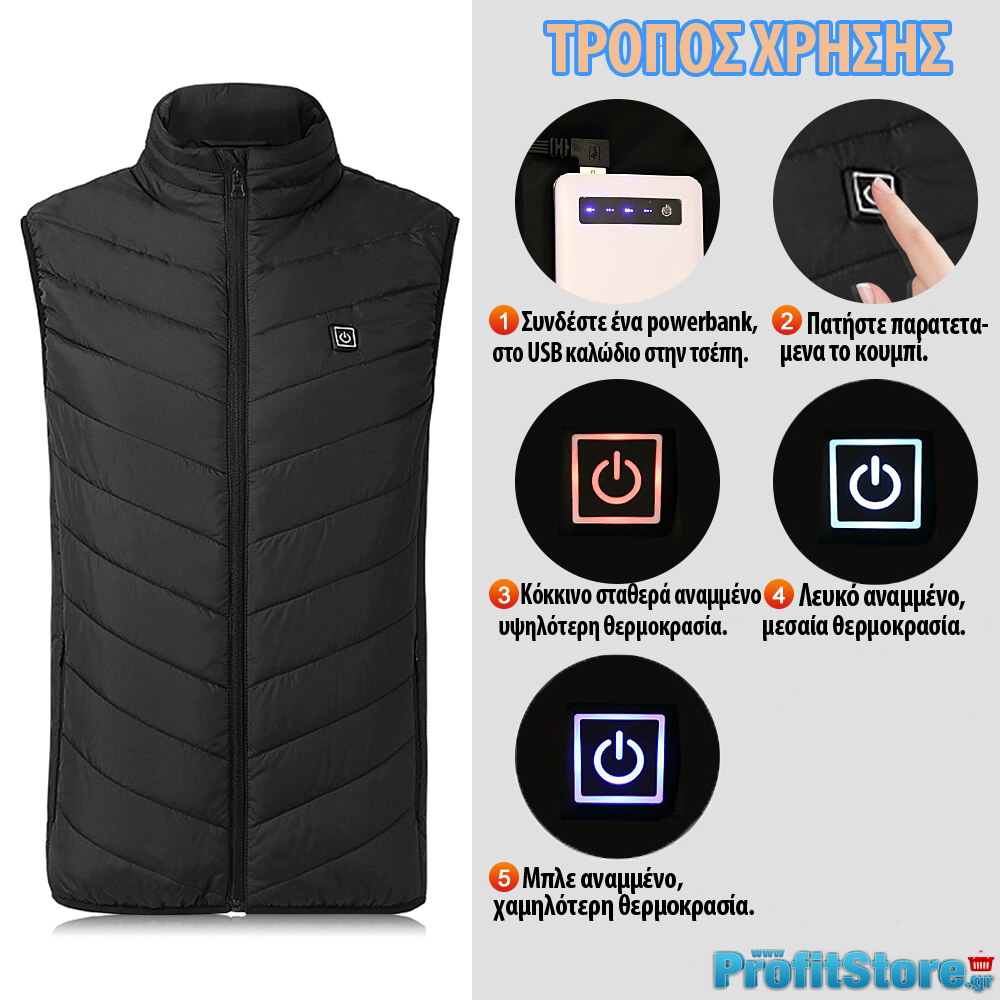 Διαθέτει 3 επίπεδα θερμότητας για να προσαρμόζετε την θερμοκρασία σας στις εκάστοτε συνθήκες ! Επίσης μπορείτε να θέσετε το γιλέκο σε λειτουργία αυτόματης θέρμανσης ώστε το γιλέκο να κρατήσει σταθερή την θερμοκρασία του σώματος (θα αναβοσβήνει κόκκινο ο διακόπτης).