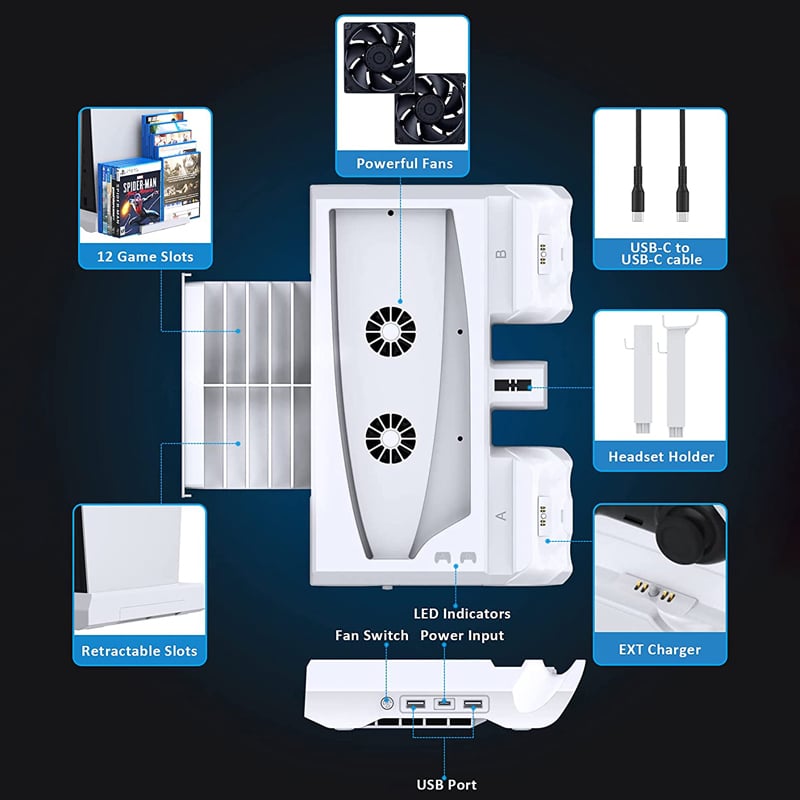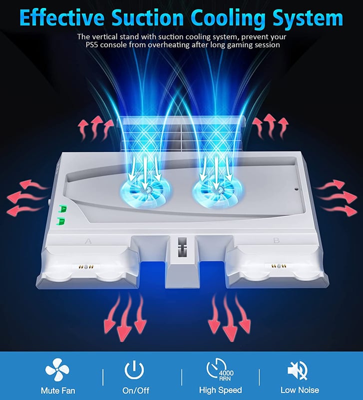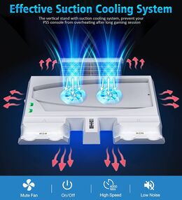 Η βάση έχει ενσωματωμένα 2 ανεμιστηράκια χαμηλού θορύβου που ρουφούν τον ζεστό αέρα από το κάτω μέρος της κονσόλας και διαχέει τη θερμότητα προς όλες τις κατευθύνσεις για να μεγιστοποιήσει τη διάρκεια ζωής του αγαπημένου σας PS5!