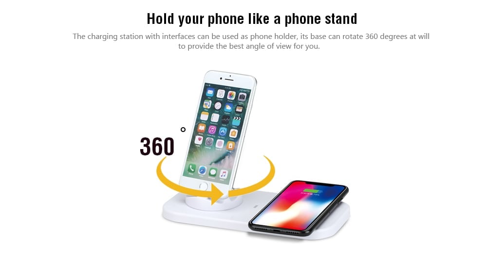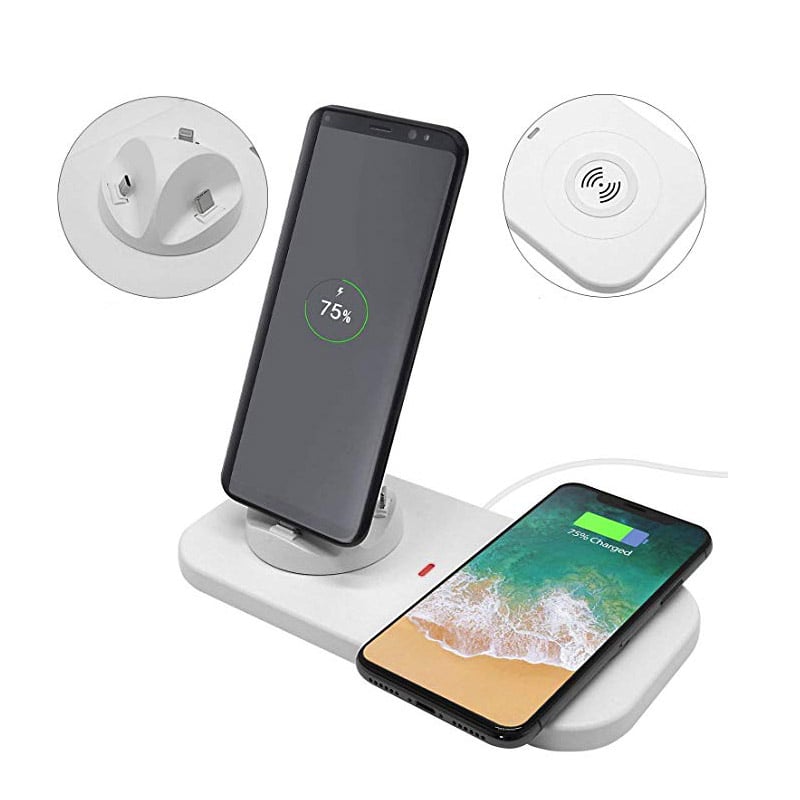 Μια συσκευή 5 σε 1 για να φορτίζετε τα κινητά σας Android ή iPhone και μάλιστα ταυτόχρονα. Μπορείτε φορτίσετε με τον κλασσικό τρόπο μέσω micro Usb ακροφυσίων αλλά και ασύρματα!