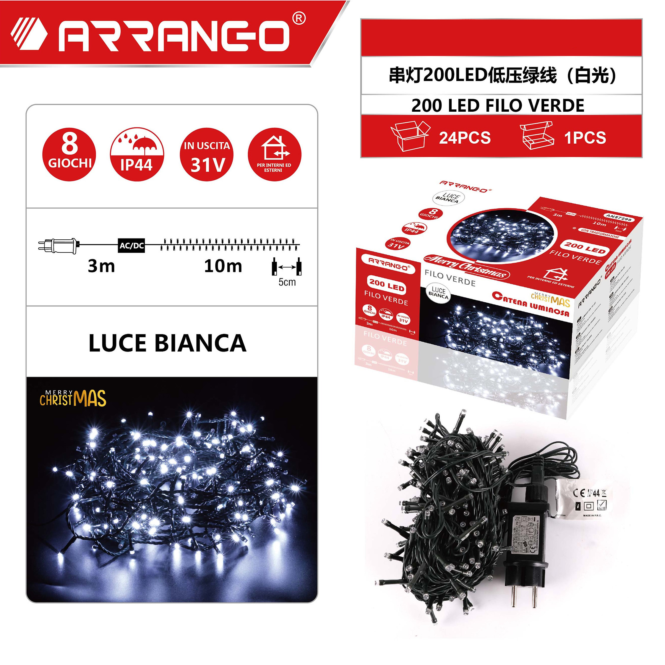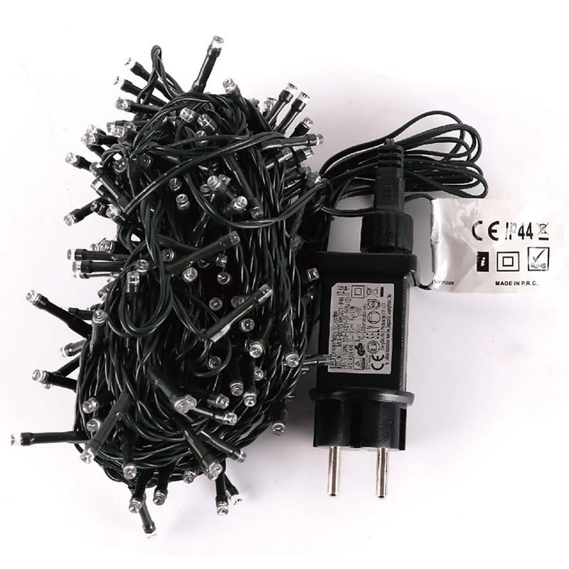 Πρόκειται για 10m λαμπάκια σε σειρά με πράσινο καλώδιο και 200 LED, όπου εκπέμπουν θερμό λευκό φωτισμό και 3m καλώδιο.