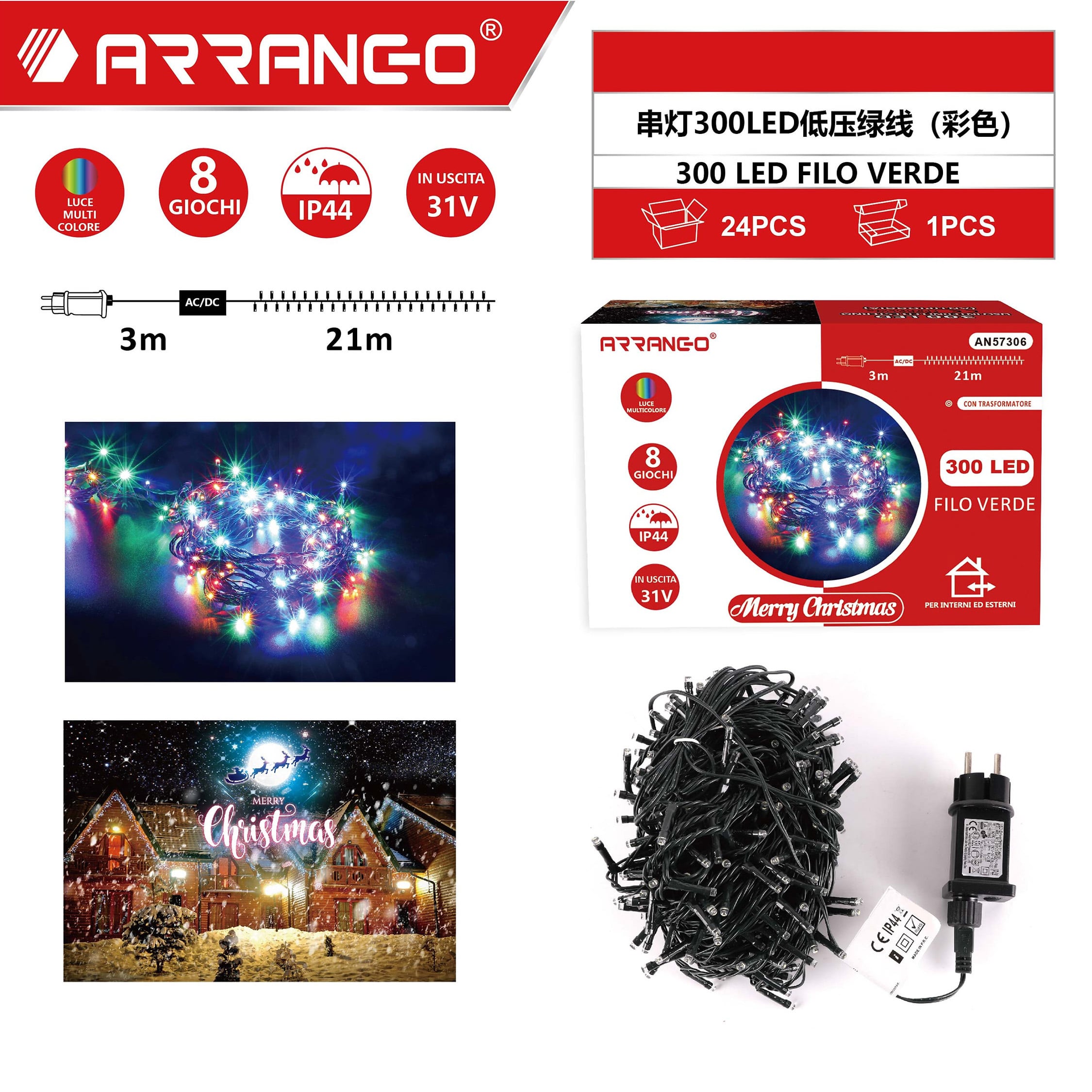 - 1 x Χριστουγεννιάτικα Αδιάβροχα Λαμπάκια 24m 300 LED Πολύχρωμου Φωτισμού με 8 Προγράμματα Arrango
