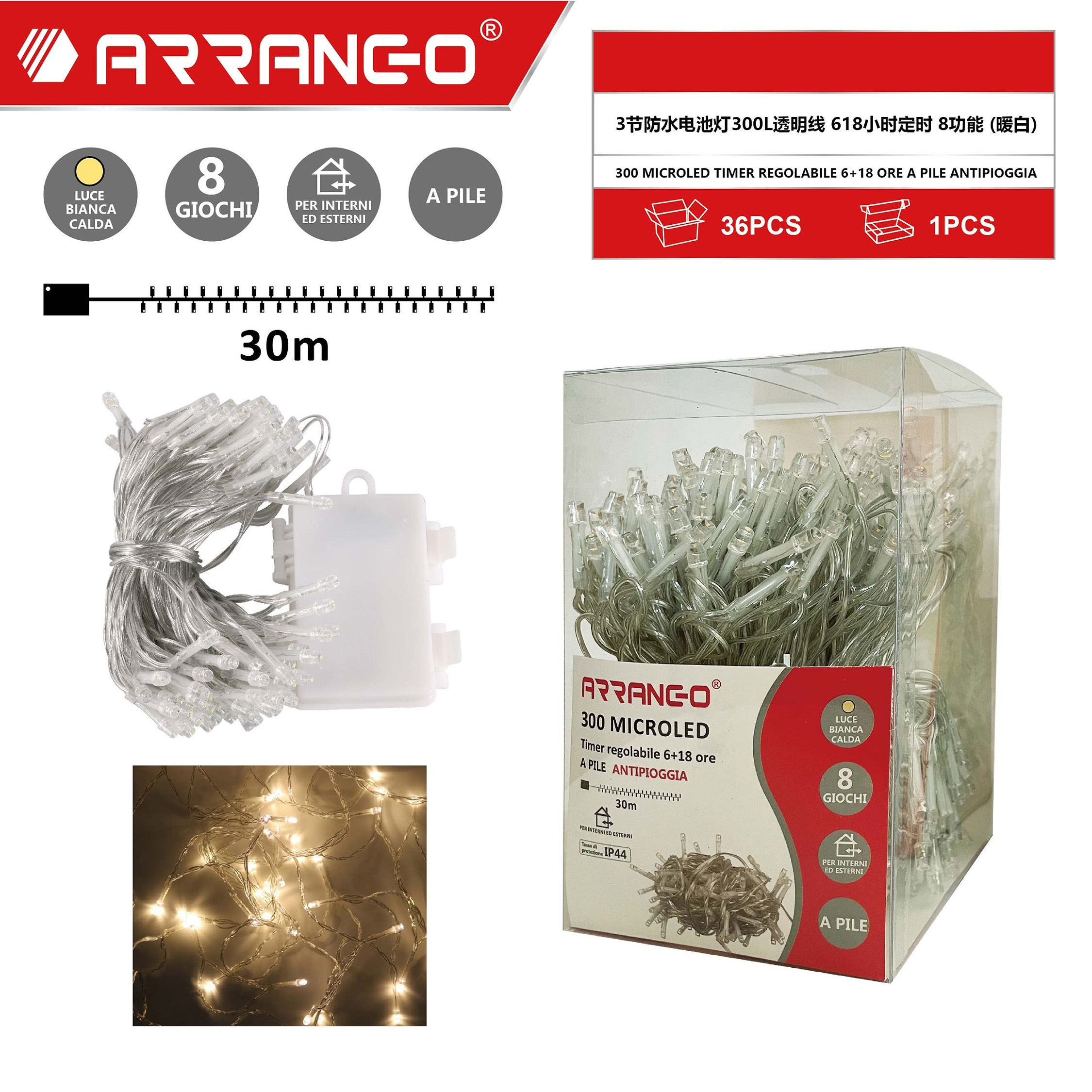 Πρόκειται για 30m λαμπάκια σε σειρά με διάφανο καλώδιο και 300 microLED, όπου εκπέμπουν θερμό λευκό φωτισμό.