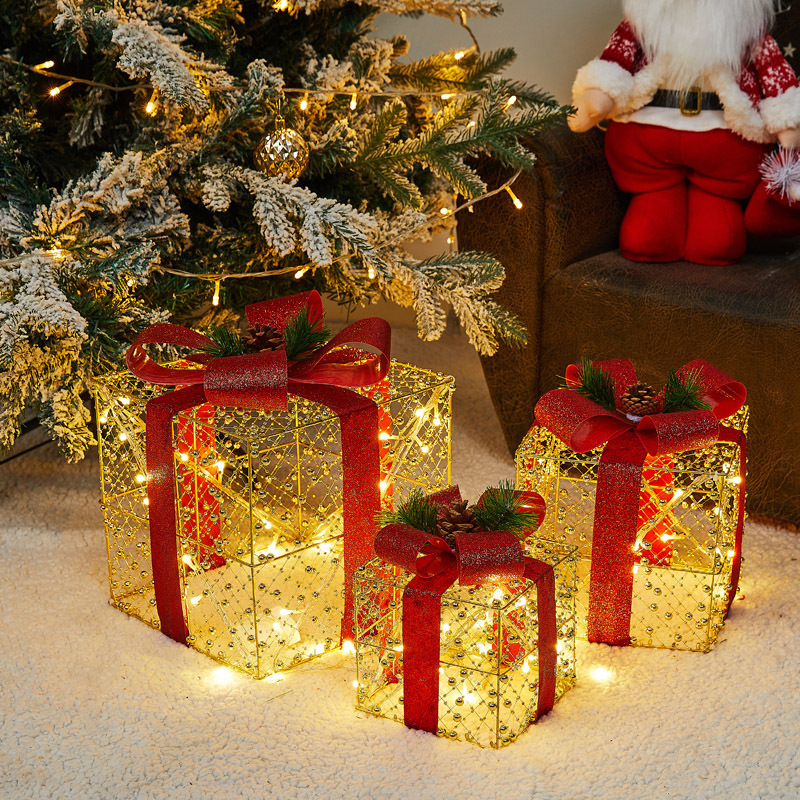 Φέρτε ζεστασιά και λάμψη στον χώρο σας με αυτό το εντυπωσιακό σετ από τρεις φωτιζόμενες χριστουγεννιάτικες κατασκευές σε σχήμα δώρου.