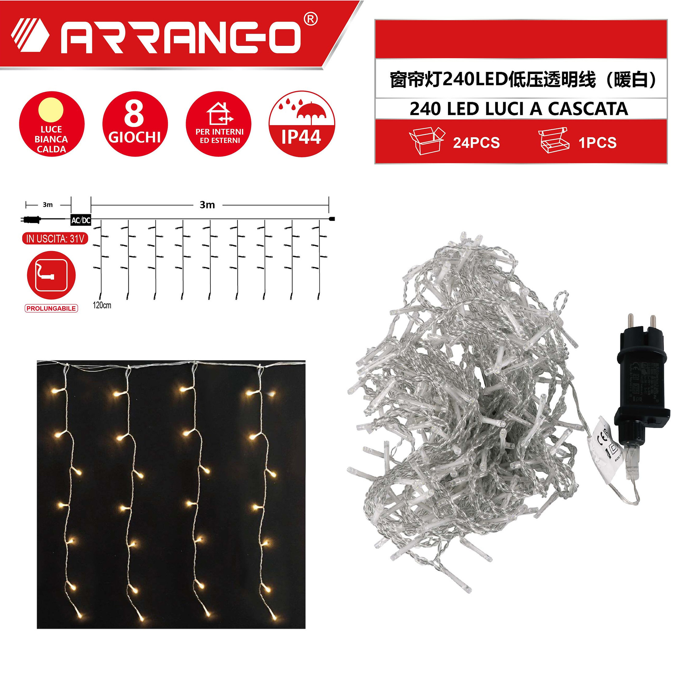 Πρόκειται για κουρτίνα με 3 μέτρα μήκος λαμπάκια που εκπέμπουν θερμό λευκό φωτισμό και 3 μέτρα καλώδιο διάφανο.